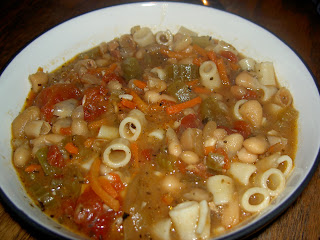 In a very large stock pot saute onion and panchetta in olive oil until panchetta is cooked through. Add in the garlic, carrots and celery and dry seasonings. Cook until vegetables are just tender, about 2-3 minutes. Add in the chicken stock, I like the Kitchen Basics chicken stock it is lower in sodium than most of the brands that claim low sodium. Add in the tomatoes and bring soup to a full boil. Once boiling turn down to a simmer and simmer for about one hour, stirring occasionally. Add in beans and simmer for another hour. In a separate large pot, boil water and cook pasta according to package directions. Put pasta in a bowl and add about a cup of the soup to keep it from sticking. Serve soup with pasta and enjoy.